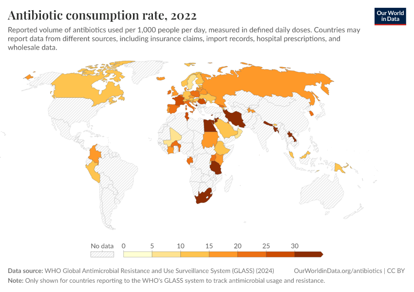 The map below shows the data collected by the World Health Organization’s GLASS system, which tracks national antimicrobial use and resistance worldwide. It shows the average level of antibiotic consumption in each country, as measured by “defined daily doses” (DDDs) per 1,000 people.