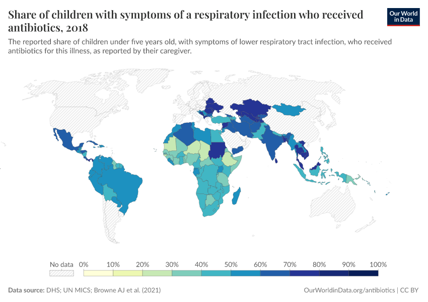 The map below shows the usage of antibiotics to treat children with respiratory infections. Data comes from large-scale surveys such as the DHS and UN MICS.