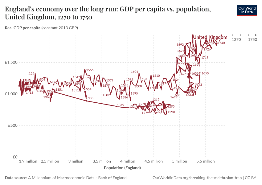 The chart above also shows when England broke out of the Malthusian trap — the first country in the world to do so. From around 1685 onwards we see what Malthus thought was impossible: the speed of innovation fueling productivity growth became so fast that both the size of the population and income per person started growing at the same time.