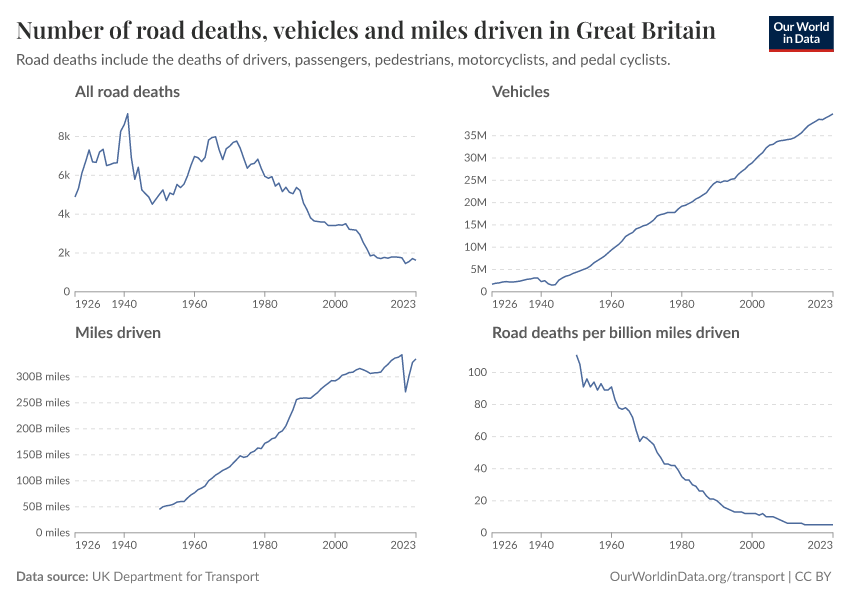 Fast-forward to today. Around 1,700 people die in road incidents each year in the UK, about a quarter of the number that used to be. That’s despite there being 16 times more vehicles on the road and 33 times as many miles driven.