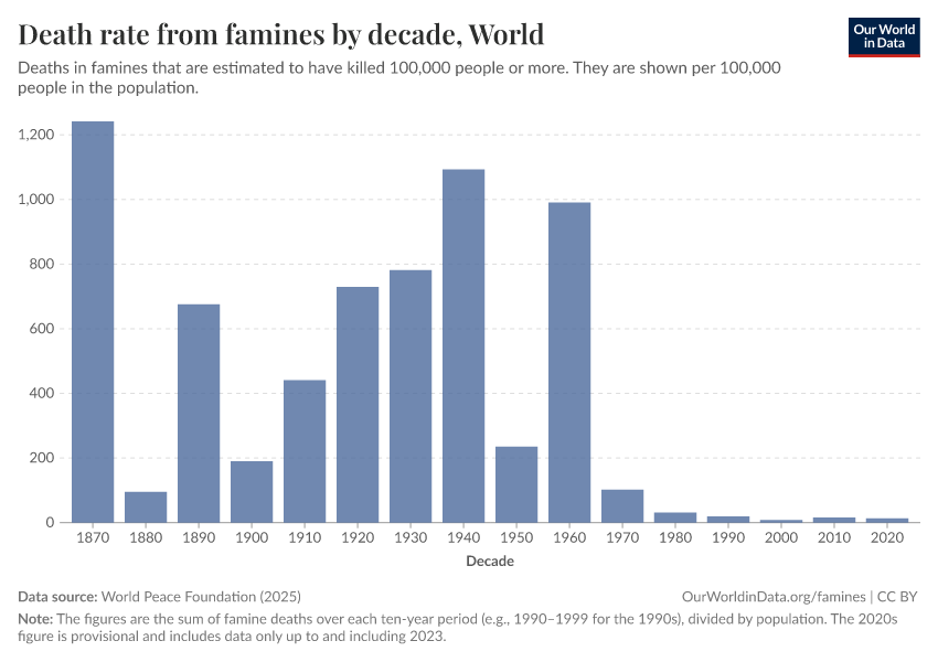 The chart is from Our World in Data. The data source is the World Peace Foundation's Historic Famines Dataset.