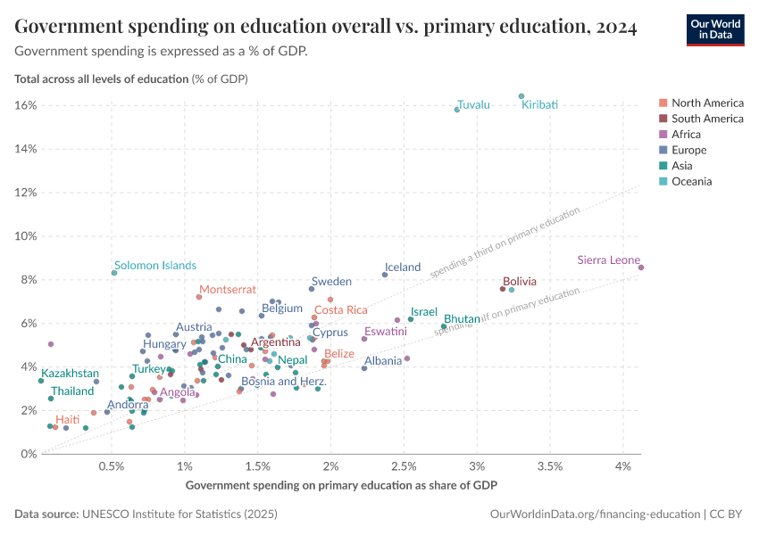 Generally speaking, countries that spend a large share of their income on education also tend to prioritize education highly within their budgets.