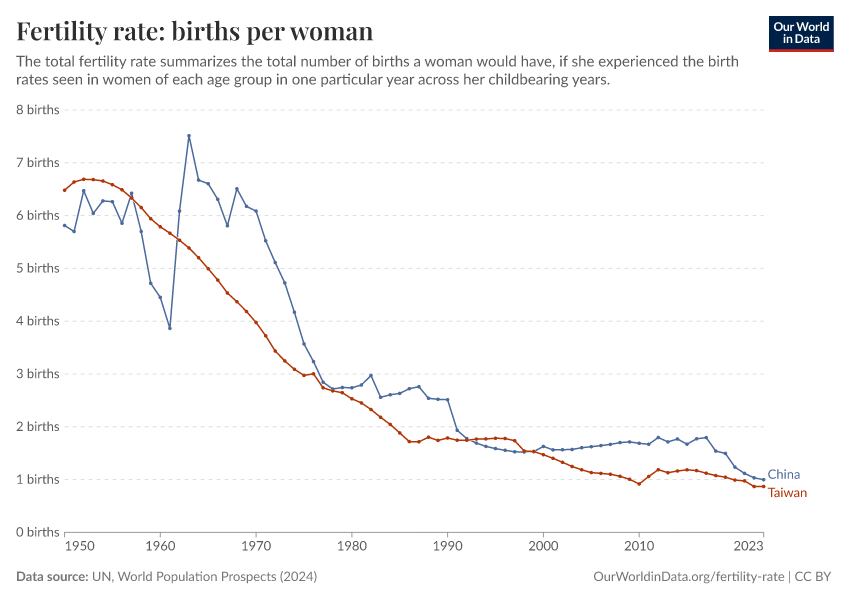 In recent years, fertility rates in Taiwan have been similar to those in China. Fertility rates in Taiwan have been close to 1 child per woman in the 2010s — just the aim that China had and never reached despite this being the planned outcome of the Chinese government.