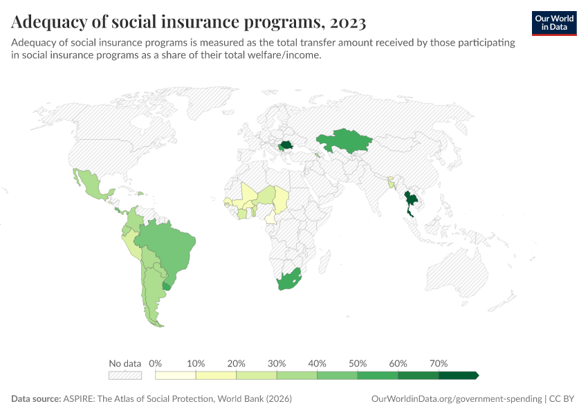 ASPIRE: The Atlas of Social Protection, World Bank (2026) – processed by Our World in Data. “Adequacy of social insurance programs” [dataset]. ASPIRE: The Atlas of Social Protection, World Bank, “World Development Indicators 125” [original data]. Retrieved February 25, 2026 from https://style-labor-employmentrate-c.owid.pages.dev:8789/20260202-181317/grapher/adequacy-of-social-insurance-programs.html (archived on February 2, 2026).