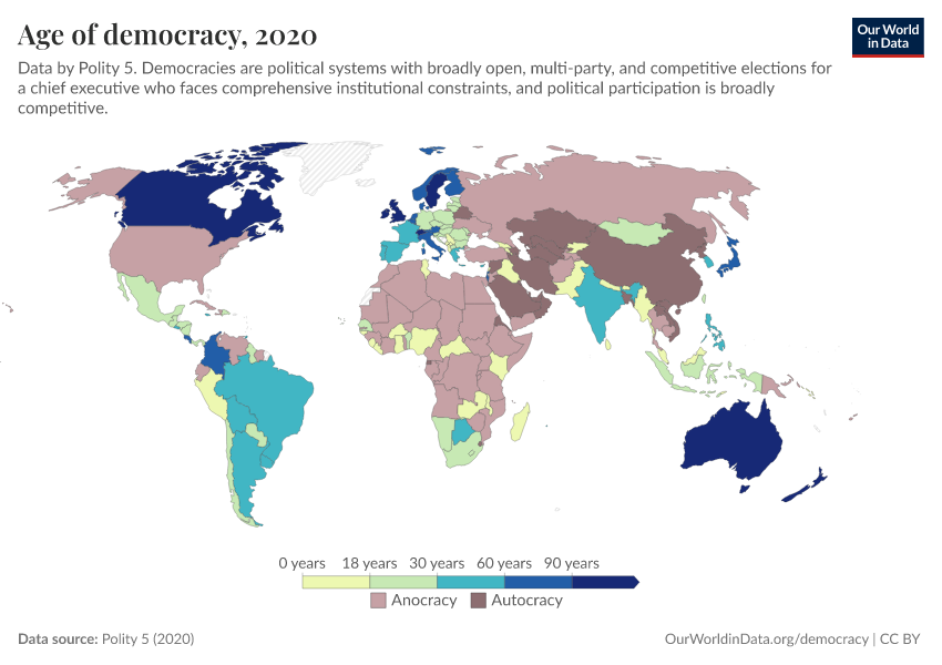 Polity 5 (2020) – processed by Our World in Data. “Age of democracy” [dataset]. Polity 5, “Polity5 Project, Political Regime Characteristics and Transitions, 1800-2018 5” [original data]. Retrieved February 25, 2026 from https://style-labor-employmentrate-c.owid.pages.dev:8789/20260223-071105/grapher/age-of-democracy-polity.html (archived on February 23, 2026).