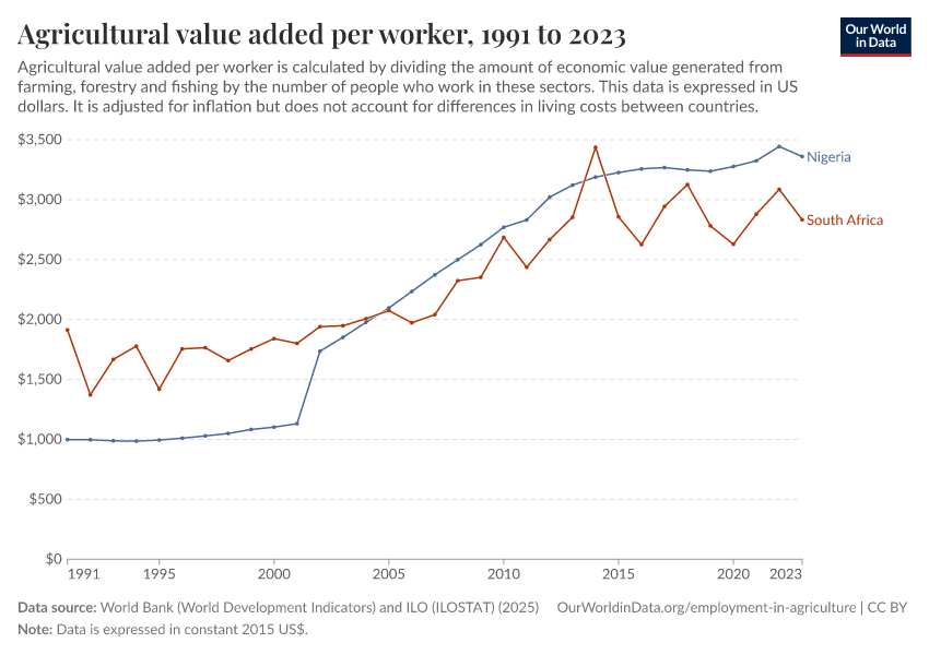 “Data Page: Agricultural value added per worker”. Our World in Data (2026). Data adapted from World Bank (World Development Indicators) and ILO (ILOSTAT). Retrieved from https://style-labor-employmentrate-c.owid.pages.dev:8789/20260129-125221/grapher/agriculture-value-added-per-worker-wdi.html [online resource] (archived on January 29, 2026).