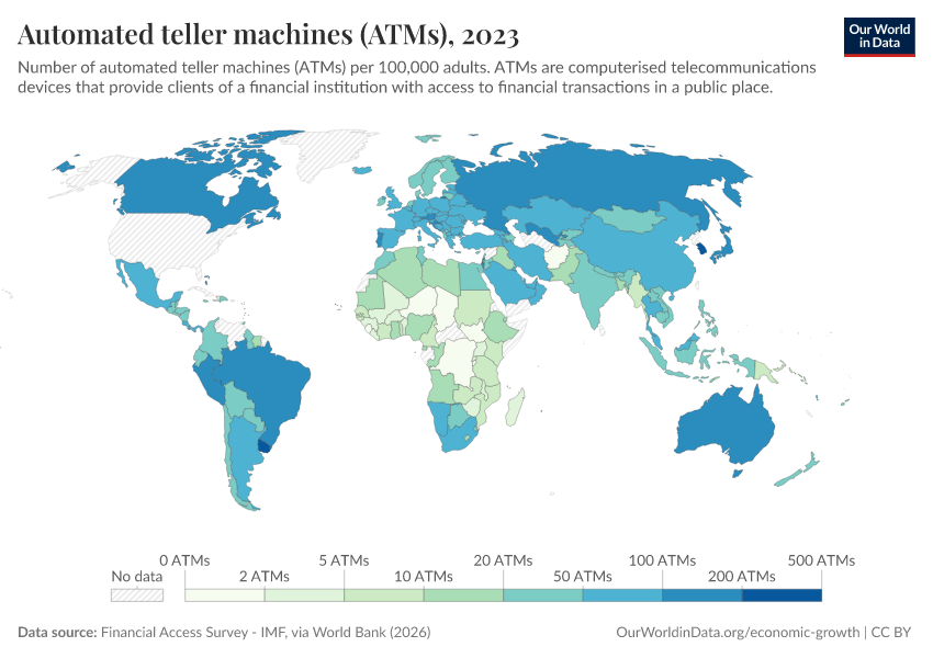 “Data Page: Automated teller machines (ATMs)”. Our World in Data (2026). Data adapted from Financial Access Survey - IMF, via World Bank. Retrieved from https://style-labor-employmentrate-c.owid.pages.dev:8789/20260202-181317/grapher/automated-teller-machines-atms-per-100000-adults.html [online resource] (archived on February 2, 2026).How to cite this data