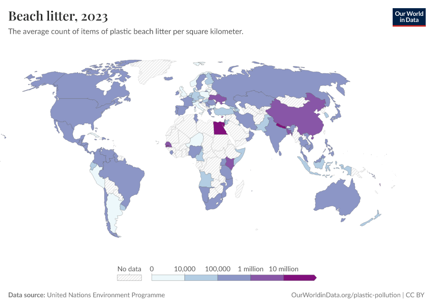 “Data Page: Beach litter”. Our World in Data (2026). Data adapted from United Nations Environment Programme. Retrieved from https://style-labor-employmentrate-c.owid.pages.dev:8789/20260105-133053/grapher/beach-litter.html [online resource] (archived on January 5, 2026).How to cite this data