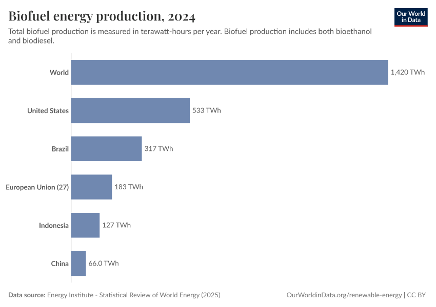 Energy Institute - Statistical Review of World Energy (2025) – with major processing by Our World in Data. “Biofuels production” [dataset]. Energy Institute, “Statistical Review of World Energy” [original data]. Retrieved February 25, 2026 from https://style-labor-employmentrate-c.owid.pages.dev:8789/20260119-065148/grapher/biofuel-production.html (archived on January 19, 2026).