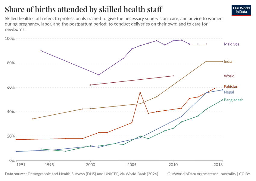 “Data Page: Share of births attended by skilled health staff”. Our World in Data (2026). Data adapted from Demographic and Health Surveys (DHS) and UNICEF, via World Bank. Retrieved from https://style-labor-employmentrate-c.owid.pages.dev:8789/20260202-181317/grapher/births-attended-by-health-staff-sdgs.html [online resource] (archived on February 2, 2026).How to cite this data