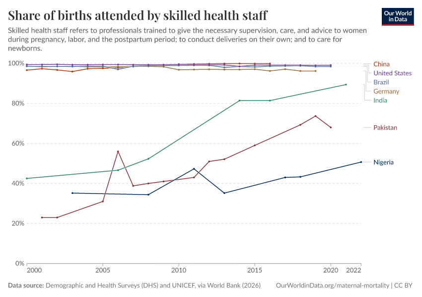 “Data Page: Share of births attended by skilled health staff”. Our World in Data (2026). Data adapted from Demographic and Health Surveys (DHS) and UNICEF, via World Bank. Retrieved from https://style-labor-employmentrate-c.owid.pages.dev:8789/20260202-181317/grapher/births-attended-by-health-staff-sdgs.html [online resource] (archived on February 2, 2026).How to cite this data