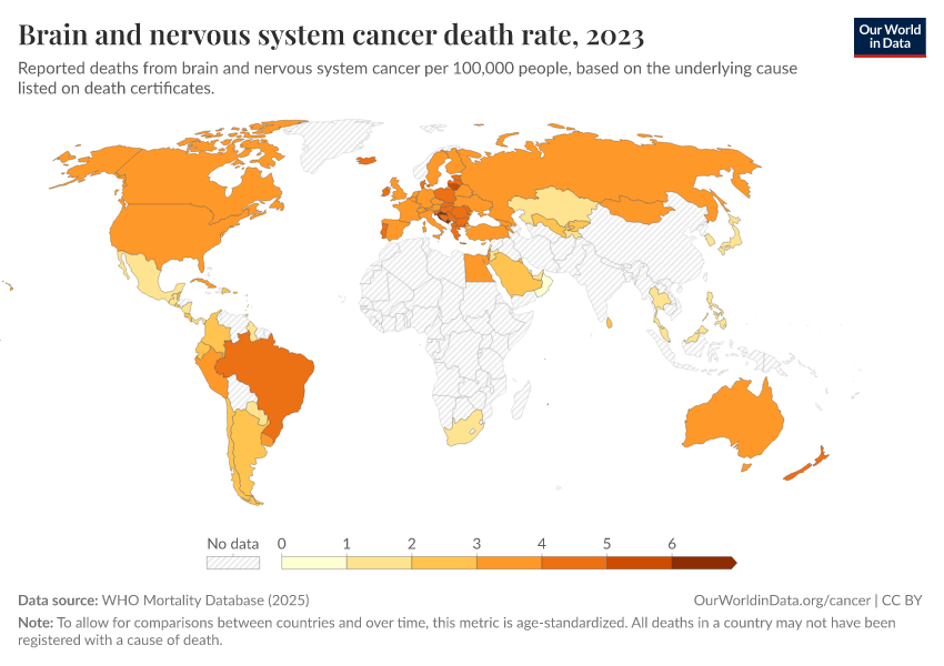 WHO Mortality Database (2025) – with minor processing by Our World in Data. “Brain and nervous system cancer death rate” [dataset]. WHO Mortality Database, “WHO Mortality Database” [original data]. Retrieved February 25, 2026 from https://style-labor-employmentrate-c.owid.pages.dev:8789/20250909-093708/grapher/brain-and-nervous-system-cancer-death-rate.html (archived on September 9, 2025).