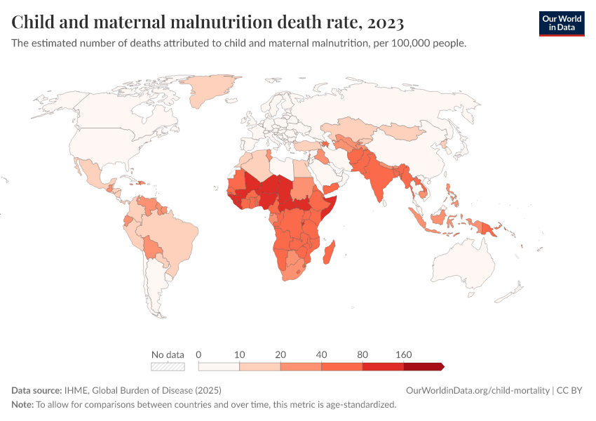 IHME, Global Burden of Disease (2025) – with major processing by Our World in Data. “Child and maternal malnutrition death rate” [dataset]. IHME, Global Burden of Disease, “Global Burden of Disease - Risk Factors - Deaths” [original data]. Retrieved February 25, 2026 from https://style-labor-employmentrate-c.owid.pages.dev:8789/20260213-112438/grapher/child-and-maternal-malnutrition-death-rate.html (archived on February 13, 2026).