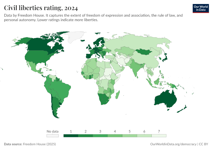Freedom House (2025) – processed by Our World in Data. “Civil liberties rating” [dataset]. Freedom House, “Freedom in the World” [original data]. Retrieved February 25, 2026 from https://style-labor-employmentrate-c.owid.pages.dev:8789/20260119-070102/grapher/civil-liberties-rating-fh.html (archived on January 19, 2026).