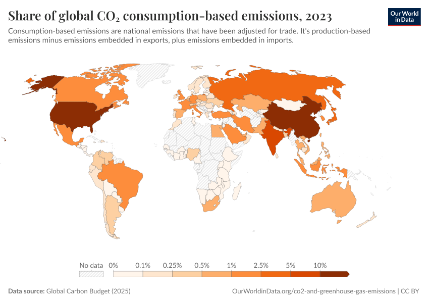 “Data Page: Share of global CO₂ consumption-based emissions”, part of the following publication: Hannah Ritchie, Pablo Rosado, and Max Roser (2023) - “CO₂ and Greenhouse Gas Emissions”. Data adapted from Global Carbon Project. Retrieved from https://style-labor-employmentrate-c.owid.pages.dev:8789/20260119-070102/grapher/co2-consumption-share.html [online resource] (archived on January 19, 2026).How to cite this data