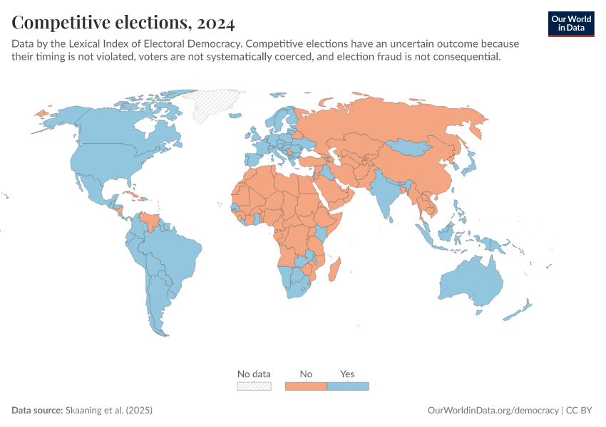 Skaaning et al. (2025) – processed by Our World in Data. “Competitive elections” [dataset]. Skaaning et al., “Lexical Index of Electoral Democracy (LIED) v6.8” [original data]. Retrieved February 25, 2026 from https://style-labor-employmentrate-c.owid.pages.dev:8789/20260119-065148/grapher/competitive-elections-lexical.html (archived on January 19, 2026).