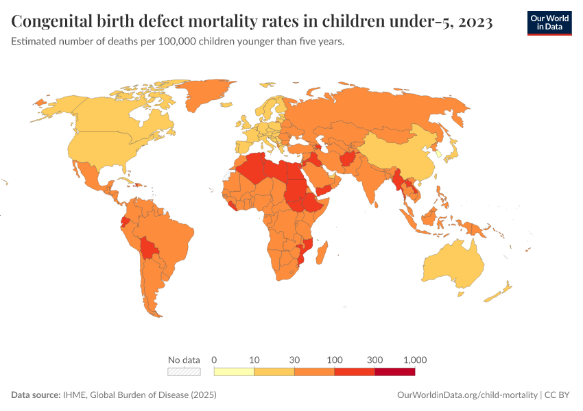 “Data Page: Congenital birth defect mortality rates in children under-5”, part of the following publication: Esteban Ortiz-Ospina and Max Roser (2016) - “Global Health”. Data adapted from IHME, Global Burden of Disease. Retrieved from https://style-labor-employmentrate-c.owid.pages.dev:8789/20260211-174736/grapher/congenital-birth-defect-mortality-rates-in-children-under-5.html [online resource] (archived on February 11, 2026).How to cite this data