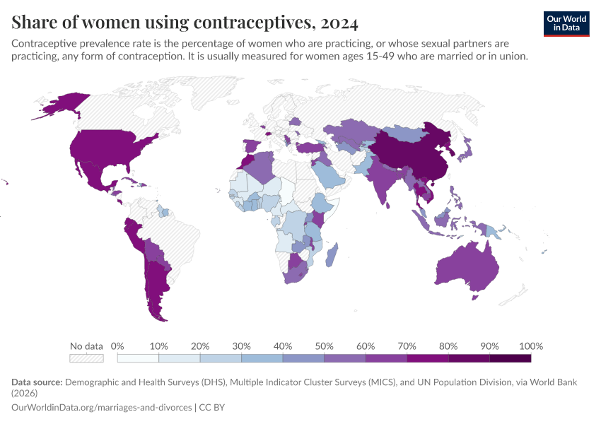 “Data Page: Share of women using contraceptives”. Our World in Data (2026). Data adapted from Demographic and Health Surveys (DHS), Multiple Indicator Cluster Surveys (MICS), and UN Population Division, via World Bank. Retrieved from https://style-labor-employmentrate-c.owid.pages.dev:8789/20260202-181317/grapher/contraceptive-prevalence-any-methods-of-women-ages-15-49.html [online resource] (archived on February 2, 2026).How to cite this data