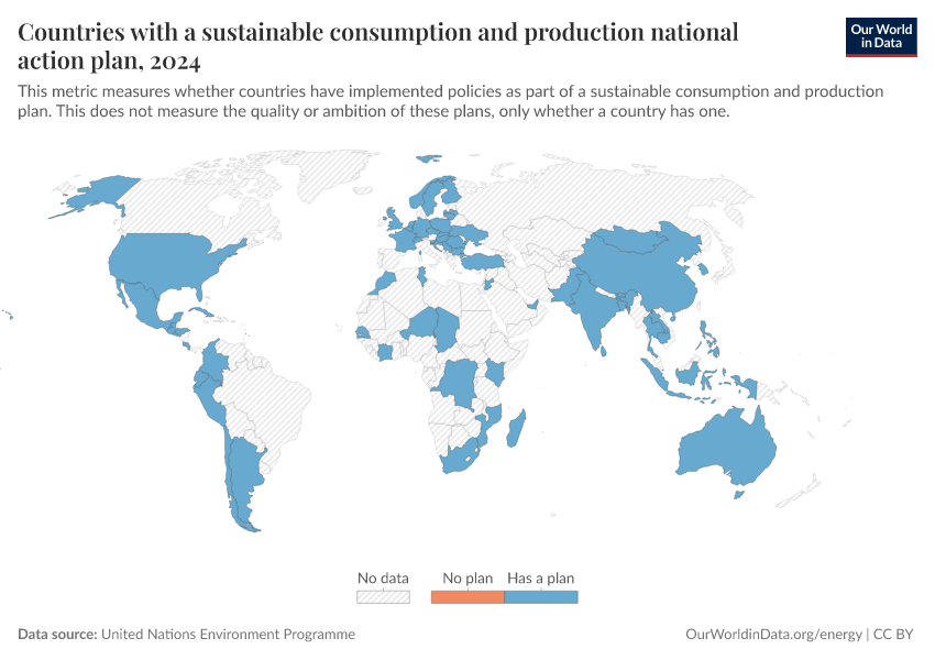 “Data Page: Countries with a sustainable consumption and production national action plan”. Our World in Data (2026). Data adapted from United Nations Environment Programme. Retrieved from https://style-labor-employmentrate-c.owid.pages.dev:8789/20260130-180113/grapher/country-scp-plan.html [online resource] (archived on January 30, 2026).How to cite this data