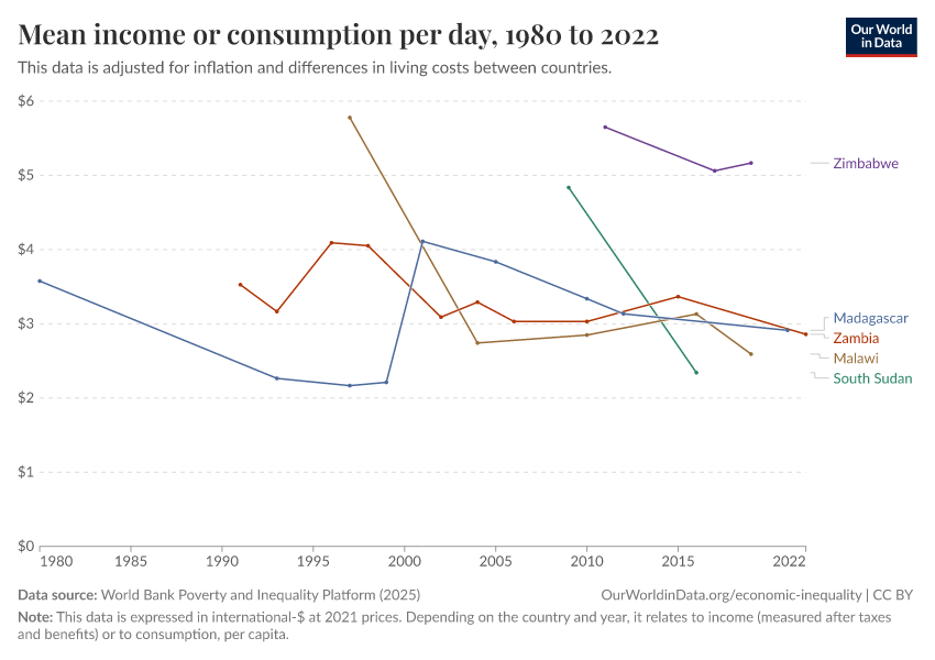 “Data Page: Mean income or consumption per day”, part of the following publication: Joe Hasell, Bertha Rohenkohl, Pablo Arriagada, Esteban Ortiz-Ospina, and Max Roser (2022) - “Poverty”. Data adapted from World Bank Poverty and Inequality Platform. Retrieved from https://style-labor-employmentrate-c.owid.pages.dev:8789/20260127-114142/grapher/daily-mean-income.html [online resource] (archived on January 27, 2026).