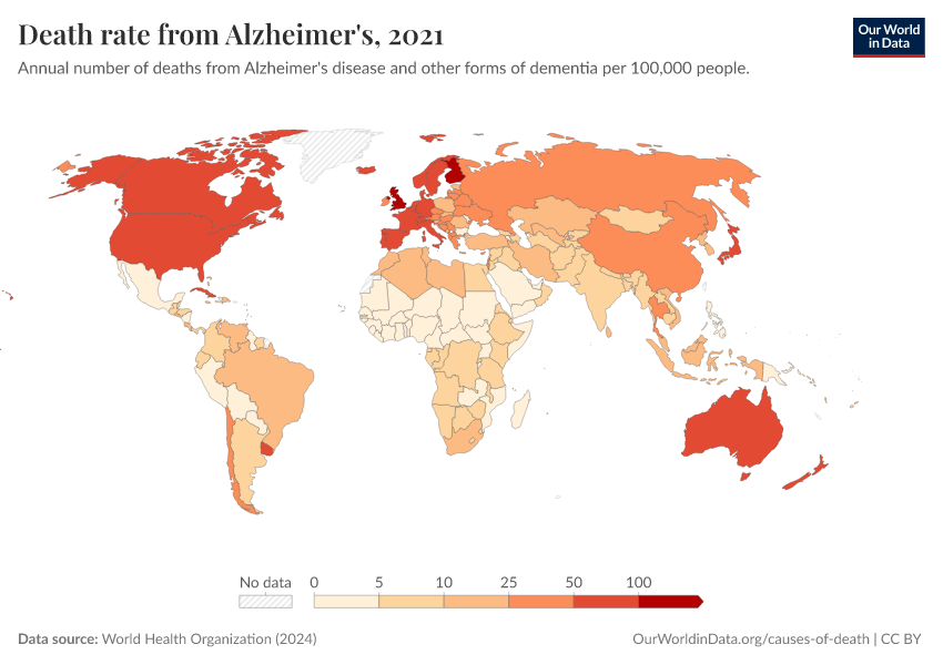 World Health Organization (2024) – with major processing by Our World in Data. “Death rate from Alzheimer's” [dataset]. World Health Organization, “Global Health Estimates” [original data]. Retrieved February 25, 2026 from https://style-labor-employmentrate-c.owid.pages.dev:8789/20250909-093708/grapher/death-rate-from-alzheimers-other-dementias-ghe.html (archived on September 9, 2025).