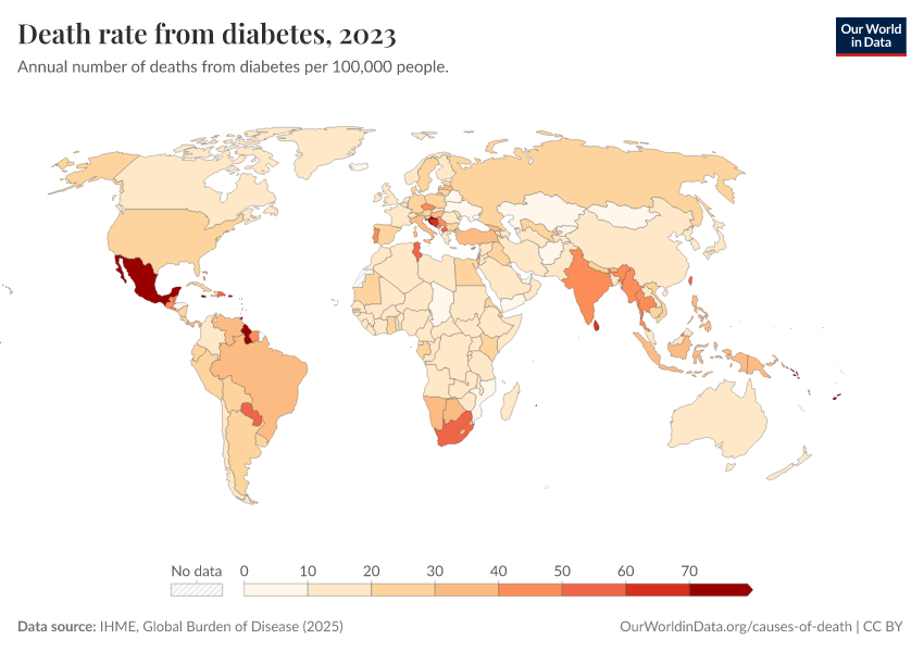 “Data Page: Death rate from diabetes”, part of the following publication: Esteban Ortiz-Ospina and Max Roser (2016) - “Global Health”. Data adapted from IHME, Global Burden of Disease. Retrieved from https://style-labor-employmentrate-c.owid.pages.dev:8789/20260211-174736/grapher/death-rate-from-diabetes-gbd.html [online resource] (archived on February 11, 2026).How to cite this data