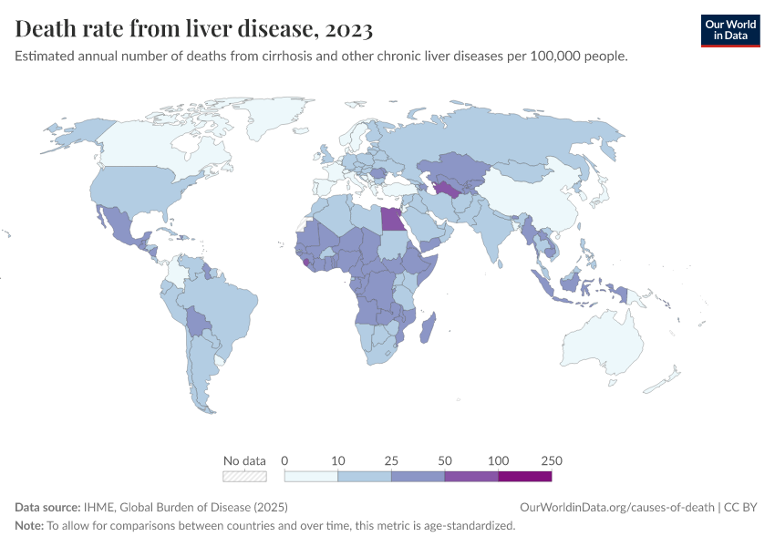 IHME, Global Burden of Disease (2025) – with major processing by Our World in Data. “Death rate from liver disease” [dataset]. IHME, Global Burden of Disease, “Global Burden of Disease - Deaths” [original data]. Retrieved February 25, 2026 from https://style-labor-employmentrate-c.owid.pages.dev:8789/20260211-174736/grapher/death-rate-from-liver-disease.html (archived on February 11, 2026).