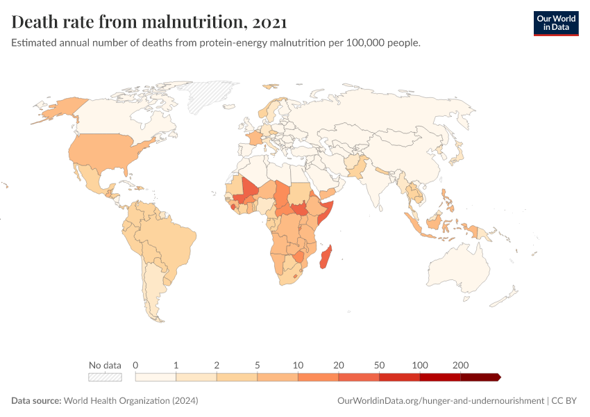 World Health Organization (2024) – with major processing by Our World in Data. “Death rate from malnutrition” [dataset]. World Health Organization, “Global Health Estimates” [original data]. Retrieved February 25, 2026 from https://style-labor-employmentrate-c.owid.pages.dev:8789/20250909-093708/grapher/death-rate-from-malnutrition-ghe.html (archived on September 9, 2025).