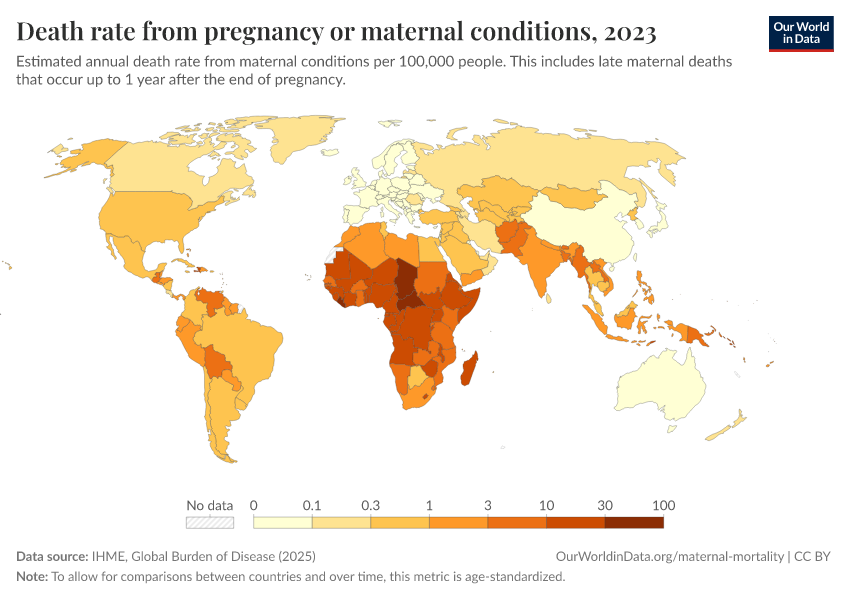 IHME, Global Burden of Disease (2025) – with major processing by Our World in Data. “Death rate from pregnancy or maternal conditions” [dataset]. IHME, Global Burden of Disease, “Global Burden of Disease - Deaths” [original data]. Retrieved February 25, 2026 from https://style-labor-employmentrate-c.owid.pages.dev:8789/20260211-174736/grapher/death-rate-from-maternal-disorders-ihme.html (archived on February 11, 2026).