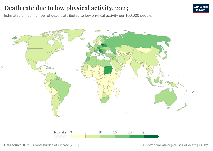 “Data Page: Death rate due to low physical activity”, part of the following publication: Esteban Ortiz-Ospina and Max Roser (2016) - “Global Health”. Data adapted from IHME, Global Burden of Disease. Retrieved from https://style-labor-employmentrate-c.owid.pages.dev:8789/20260213-112438/grapher/death-rates-due-to-low-physical-activity-gbd.html [online resource] (archived on February 13, 2026).How to cite this data