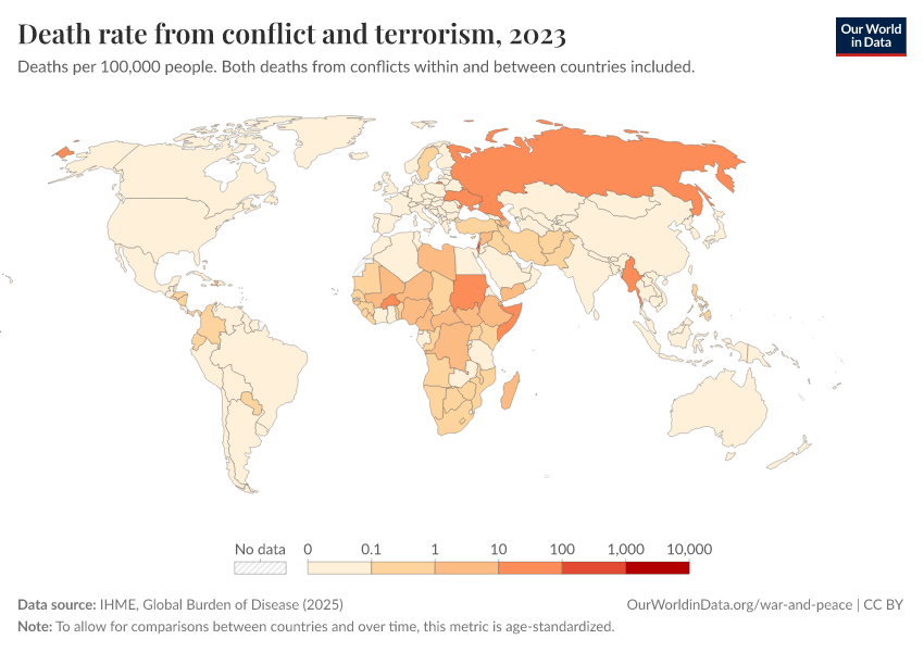 The estimated number of age-standardized deaths from conflict and terrorism, per 100,000 people.