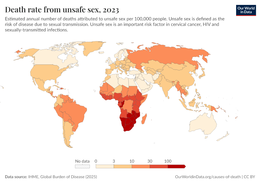 IHME, Global Burden of Disease (2025) – with major processing by Our World in Data. “Death rate from unsafe sex” [dataset]. IHME, Global Burden of Disease, “Global Burden of Disease - Risk Factors - Deaths” [original data]. Retrieved February 25, 2026 from https://style-labor-employmentrate-c.owid.pages.dev:8789/20260213-113303/grapher/death-rates-from-unsafe-sex-gbd.html (archived on February 13, 2026).
