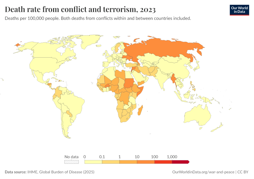 “Data Page: Death rate from conflict and terrorism”, part of the following publication: Esteban Ortiz-Ospina and Max Roser (2016) - “Global Health”. Data adapted from IHME, Global Burden of Disease. Retrieved from https://style-labor-employmentrate-c.owid.pages.dev:8789/20260211-173942/grapher/deaths-conflict-terrorism-per-100000.html [online resource] (archived on February 11, 2026).How to cite this data