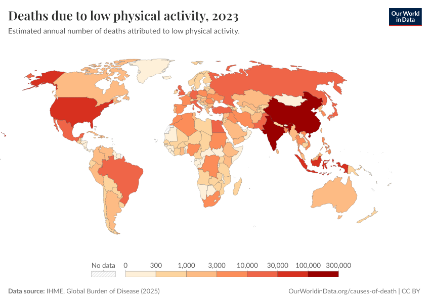 “Data Page: Deaths due to low physical activity”, part of the following publication: Esteban Ortiz-Ospina and Max Roser (2016) - “Global Health”. Data adapted from IHME, Global Burden of Disease. Retrieved from https://style-labor-employmentrate-c.owid.pages.dev:8789/20260213-112438/grapher/deaths-due-to-low-physical-activity.html [online resource] (archived on February 13, 2026).How to cite this data