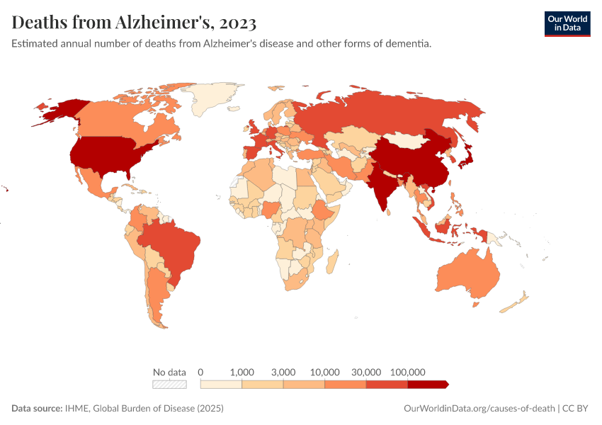 IHME, Global Burden of Disease (2025) – with major processing by Our World in Data. “Deaths from Alzheimer's” [dataset]. IHME, Global Burden of Disease, “Global Burden of Disease - Deaths” [original data]. Retrieved February 25, 2026 from https://style-labor-employmentrate-c.owid.pages.dev:8789/20260211-174736/grapher/deaths-from-alzheimers.html (archived on February 11, 2026).