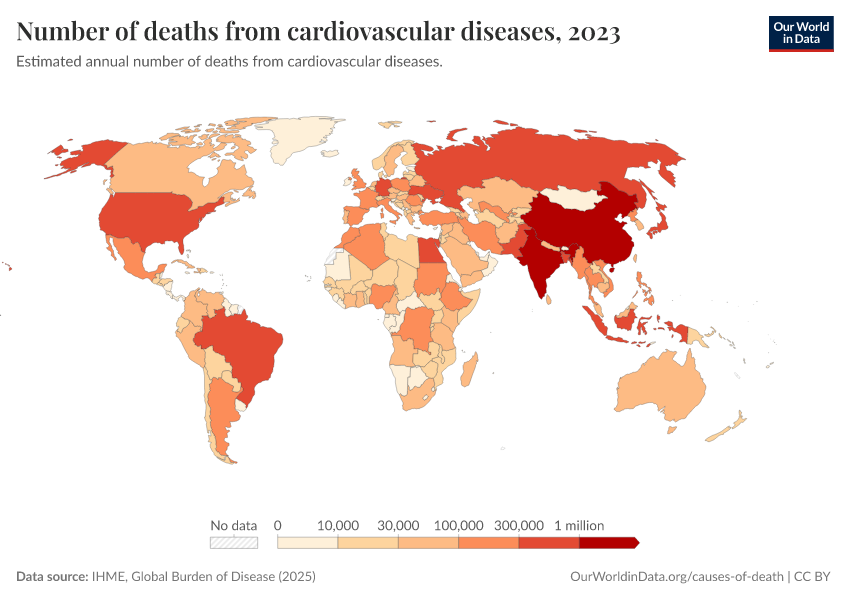“Data Page: Number of deaths from cardiovascular diseases”, part of the following publication: Esteban Ortiz-Ospina and Max Roser (2016) - “Global Health”. Data adapted from IHME, Global Burden of Disease. Retrieved from https://style-labor-employmentrate-c.owid.pages.dev:8789/20260211-174736/grapher/deaths-from-cardiovascular-disease.html [online resource] (archived on February 11, 2026).How to cite this data