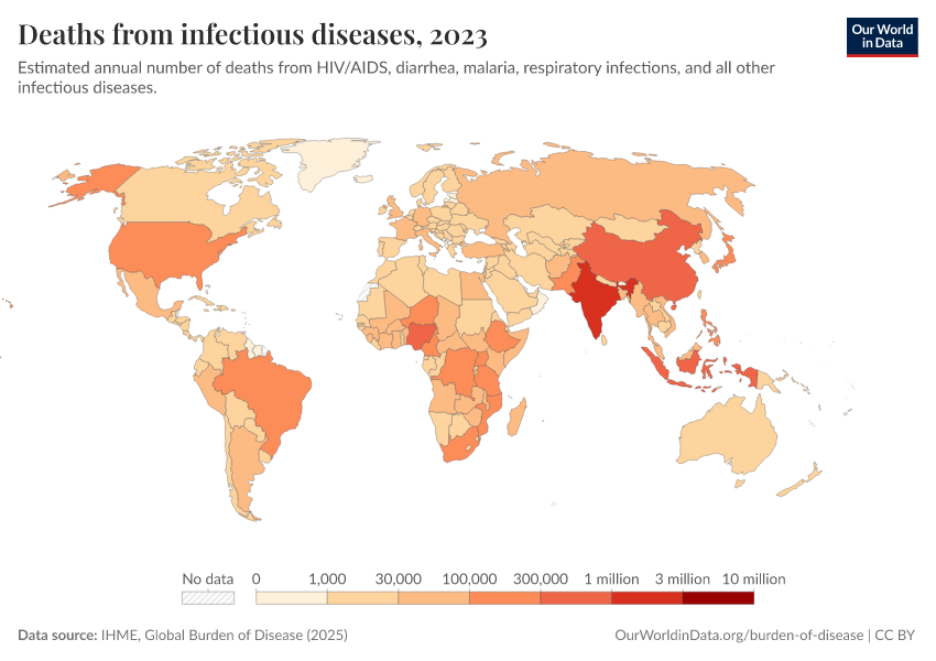 IHME, Global Burden of Disease (2025) – with major processing by Our World in Data. “Deaths from infectious diseases” [dataset]. IHME, Global Burden of Disease, “Global Burden of Disease - Deaths” [original data]. Retrieved February 25, 2026 from https://style-labor-employmentrate-c.owid.pages.dev:8789/20260211-174736/grapher/deaths-from-infectious-diseases.html (archived on February 11, 2026).