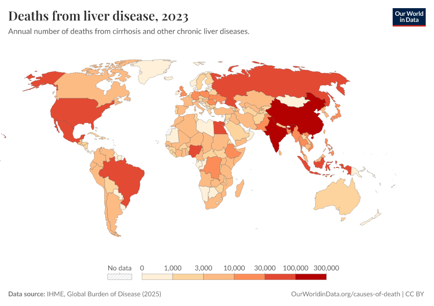IHME, Global Burden of Disease (2025) – with major processing by Our World in Data. “Deaths from liver disease” [dataset]. IHME, Global Burden of Disease, “Global Burden of Disease - Deaths” [original data]. Retrieved February 25, 2026 from https://style-labor-employmentrate-c.owid.pages.dev:8789/20260211-174736/grapher/deaths-from-liver-disease.html (archived on February 11, 2026).