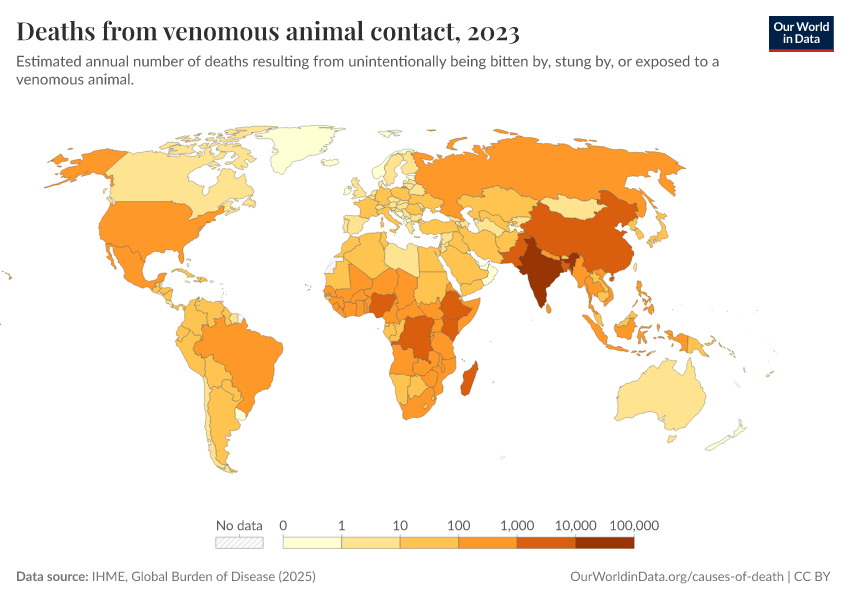 IHME, Global Burden of Disease (2025) – with major processing by Our World in Data. “Deaths from venomous animal contact” [dataset]. IHME, Global Burden of Disease, “Global Burden of Disease - Deaths” [original data]. Retrieved February 25, 2026 from https://style-labor-employmentrate-c.owid.pages.dev:8789/20260211-174736/grapher/deaths-from-venomous-animal-contact.html (archived on February 11, 2026).