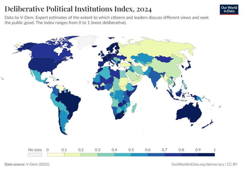 V-Dem (2025) – processed by Our World in Data. “Deliberative political institutions index – V-Dem” [dataset]. V-Dem, “Democracy report v15” [original data]. Retrieved February 25, 2026 from https://style-labor-employmentrate-c.owid.pages.dev:8789/20260119-070102/grapher/deliberative-political-institutions-index.html (archived on January 19, 2026).