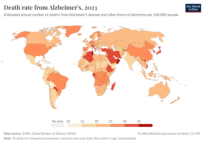 IHME, Global Burden of Disease (2025) – with major processing by Our World in Data. “Death rate from Alzheimer's” [dataset]. IHME, Global Burden of Disease, “Global Burden of Disease - Deaths” [original data]. Retrieved February 25, 2026 from https://style-labor-employmentrate-c.owid.pages.dev:8789/20260211-173942/grapher/dementia-death-rates.html (archived on February 11, 2026).