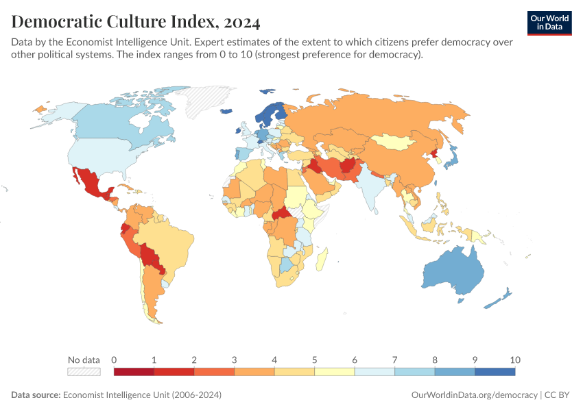 Economist Intelligence Unit (2006-2024) – processed by Our World in Data. “Democratic Culture Index” [dataset]. Economist Intelligence Unit, “Democracy Index 2021: The China challenge”; Economist Intelligence Unit, “Democracy Index 2022: Frontline democracy and the battle for Ukraine”; Economist Intelligence Unit, “Democracy Index 2023: Age of Conflict”; Economist Intelligence Unit, “Democracy Index 2024: What's wrong with representative democracy?”; Gapminder, “Democracy Index v4”; Various sources, “Population” [original data]. Retrieved February 25, 2026 from https://style-labor-employmentrate-c.owid.pages.dev:8789/20260119-070102/grapher/democratic-culture-index-eiu.html (archived on January 19, 2026).