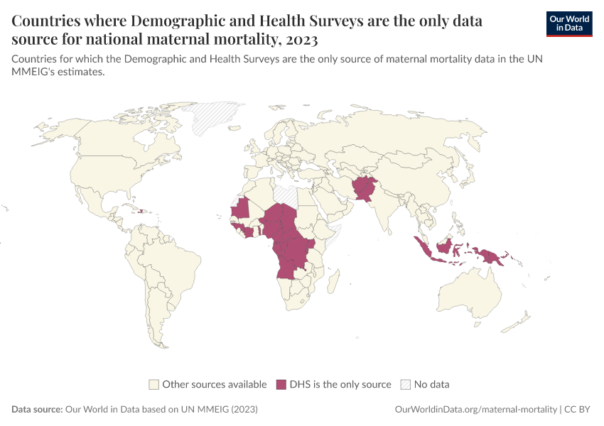 “Data Page: Countries where Demographic and Health Surveys are the only data source for national maternal mortality”. Our World in Data (2026). Data adapted from Our World in Data based on UN MMEIG. Retrieved from https://style-labor-employmentrate-c.owid.pages.dev:8789/20260224-141219/grapher/dhs-is-the-only-source-of-maternal-mortality-data.html [online resource] (archived on February 24, 2026).How to cite this data