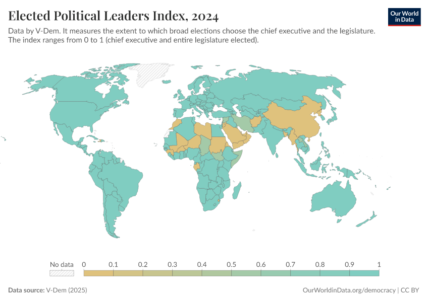 V-Dem (2025) – processed by Our World in Data. “Elected officials index” [dataset]. V-Dem, “Democracy report v15” [original data]. Retrieved February 25, 2026 from https://style-labor-employmentrate-c.owid.pages.dev:8789/20260119-070102/grapher/elected-political-leaders-index.html (archived on January 19, 2026).