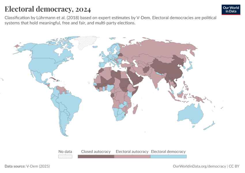 V-Dem (2025) – processed by Our World in Data. “Political regime – reduced” [dataset]. V-Dem, “Democracy report v15” [original data]. Retrieved February 25, 2026 from https://style-labor-employmentrate-c.owid.pages.dev:8789/20260119-070102/grapher/electoral-democracy-row.html (archived on January 19, 2026).