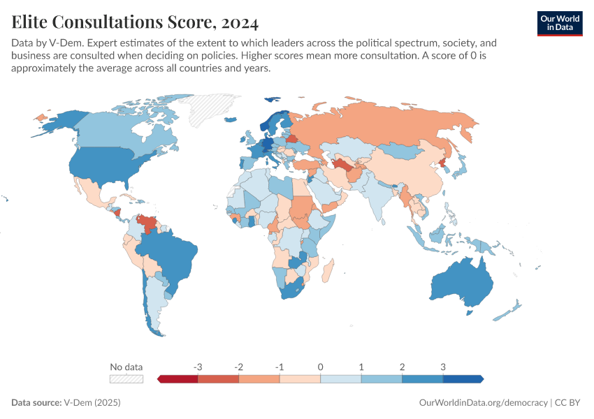 V-Dem (2025) – processed by Our World in Data. “Elite consultation – V-Dem” [dataset]. V-Dem, “Democracy report v15” [original data]. Retrieved February 25, 2026 from https://style-labor-employmentrate-c.owid.pages.dev:8789/20260204-170225/grapher/elite-consultations-score.html (archived on February 4, 2026).