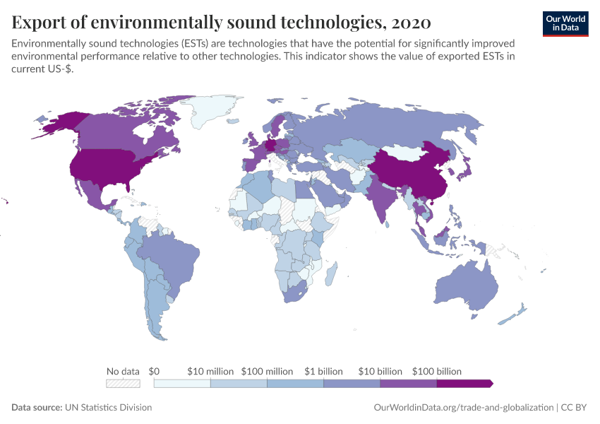 UN Statistics Division – processed by Our World in Data. “Export of environmentally sound technologies” [dataset]. UN Statistics Division, “WESR / UN COMTRADE” [original data]. Retrieved February 25, 2026 from https://style-labor-employmentrate-c.owid.pages.dev:8789/20260130-180113/grapher/export-of-environmentally-sound-technologies.html (archived on January 30, 2026).