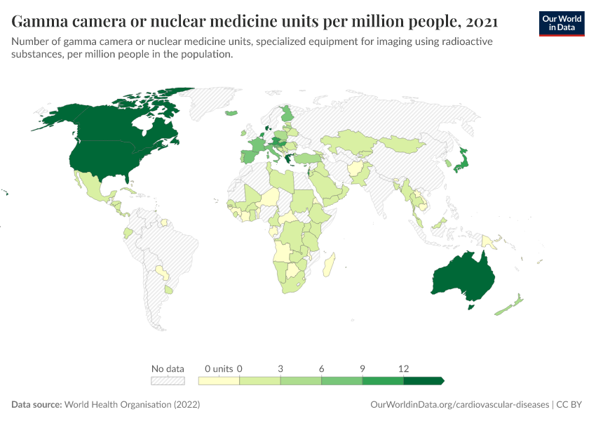 “Data Page: Gamma camera or nuclear medicine units per million people”, part of the following publication: Saloni Dattani, Veronika Samborska, Hannah Ritchie, and Max Roser (2023) - “Cardiovascular Diseases”. Data adapted from World Health Organisation. Retrieved from https://style-labor-employmentrate-c.owid.pages.dev:8789/20250909-093708/grapher/gamma-camera-or-nuclear-medicine-availability.html [online resource] (archived on September 9, 2025).How to cite this data