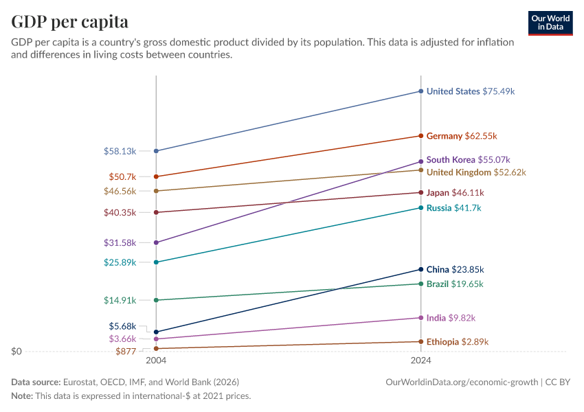 “Data Page: GDP per capita”, part of the following publication: Max Roser, Bertha Rohenkohl, Pablo Arriagada, Joe Hasell, Hannah Ritchie, and Esteban Ortiz-Ospina (2023) - “Economic Growth”. Data adapted from Eurostat, OECD, IMF, and World Bank. Retrieved from https://style-labor-employmentrate-c.owid.pages.dev:8789/20260202-180243/grapher/gdp-per-capita-worldbank.html [online resource] (archived on February 2, 2026).