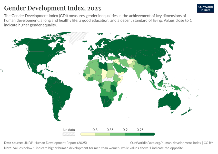 UNDP, Human Development Report (2025) – with minor processing by Our World in Data. “Gender Development Index – UNDP” [dataset]. UNDP, Human Development Report, “Human Development Report” [original data]. Retrieved February 25, 2026 from https://style-labor-employmentrate-c.owid.pages.dev:8789/20260119-065148/grapher/gender-development-index.html (archived on January 19, 2026).